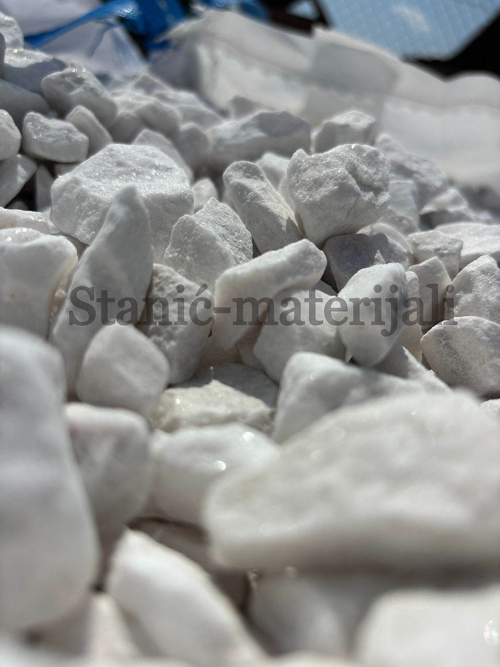 Bijeli lomljeni kamen, često izrađen od mramora, koristi se za estetsko uređenje vrtova, staza i drugih prostora, ali i za funkcionalne svrhe poput suzbijanja korova i smanjenja gubitka vlage u tlu.